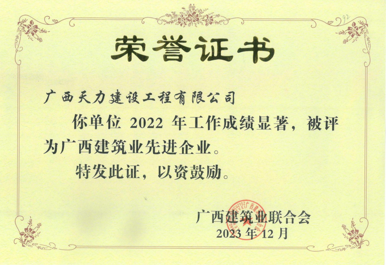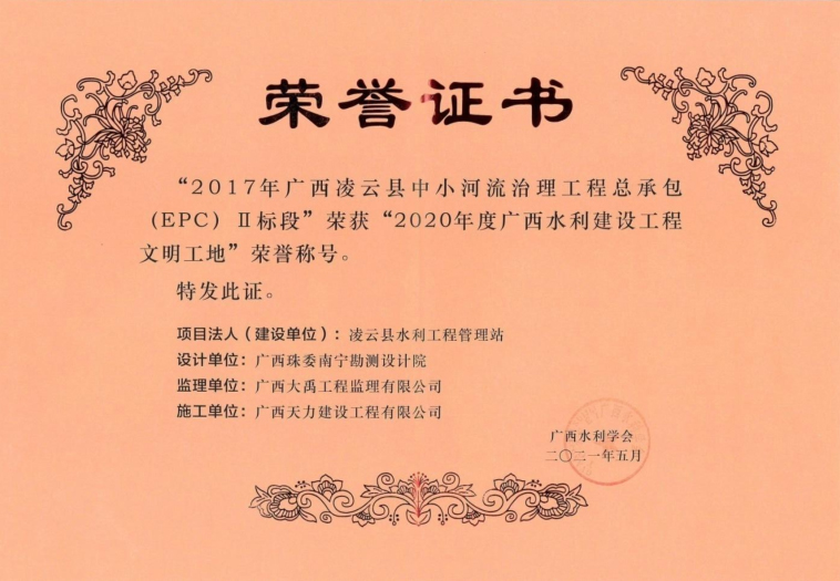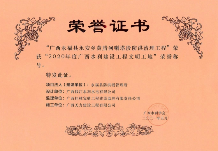 2021年5月获得2020年度广西水利建设工程文明工地1