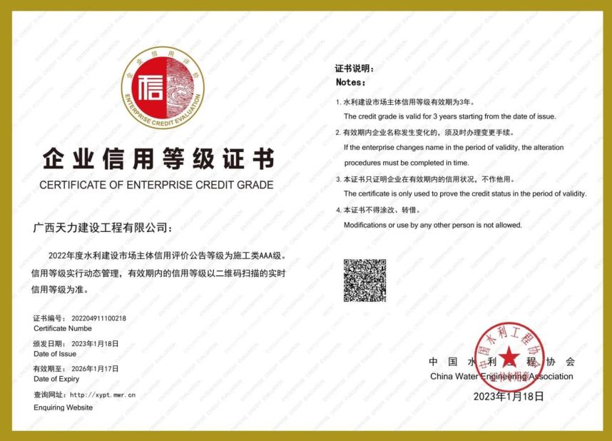 中国水利工程协会施工类 AAA 级企业信用等级证书