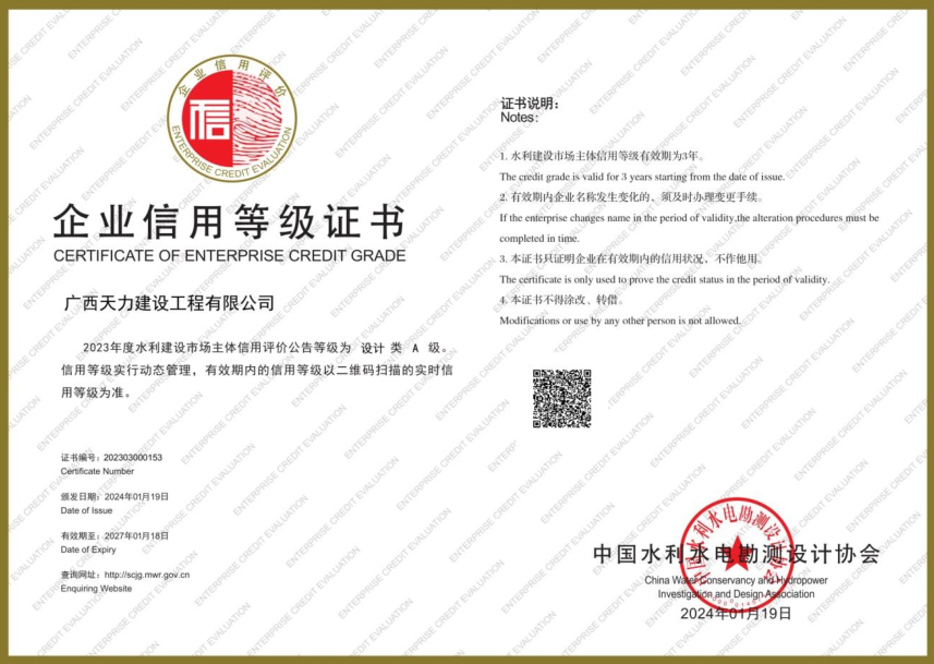 中国水利水电勘测设计协会设计类A级企业信用等级证书